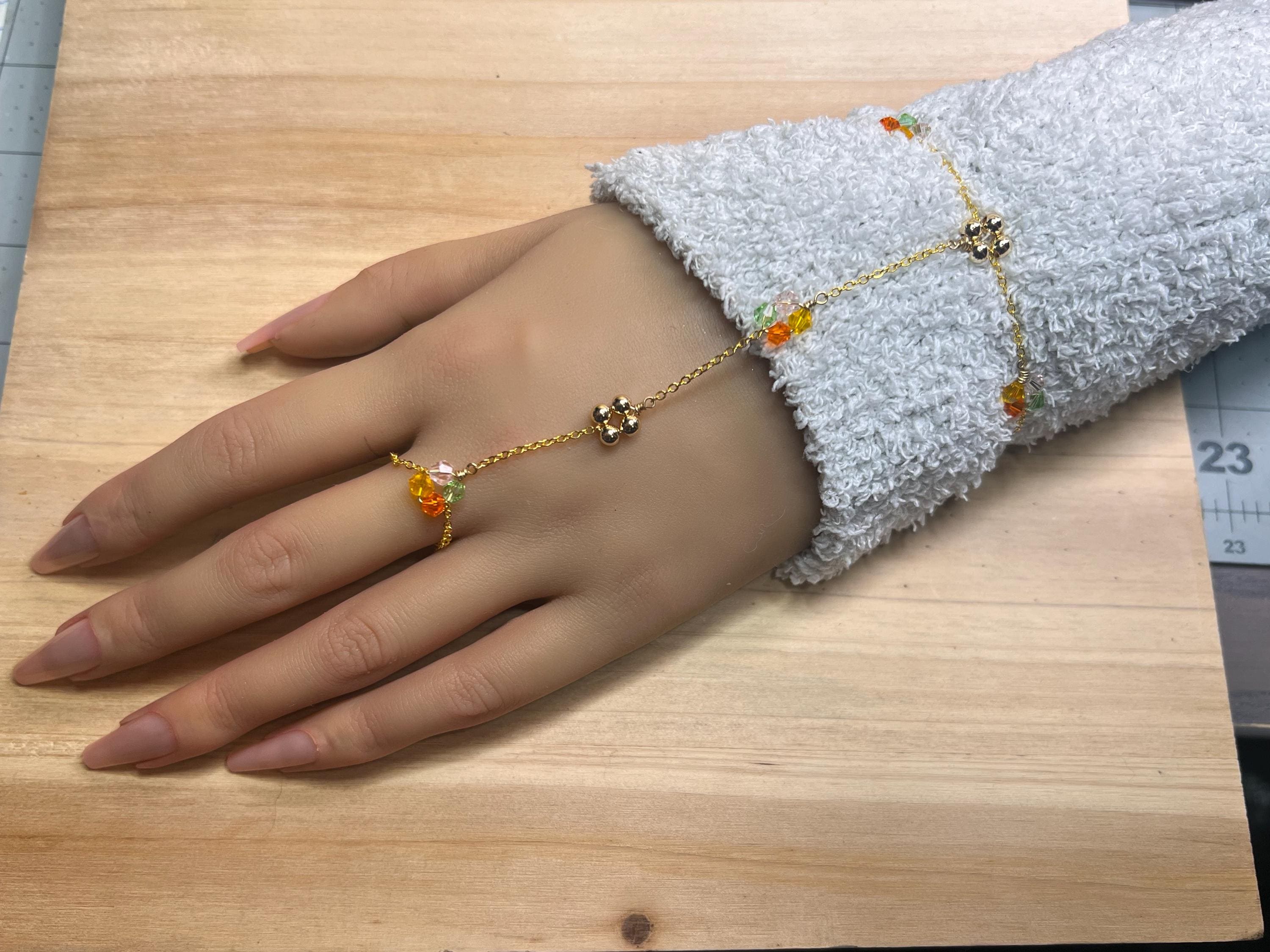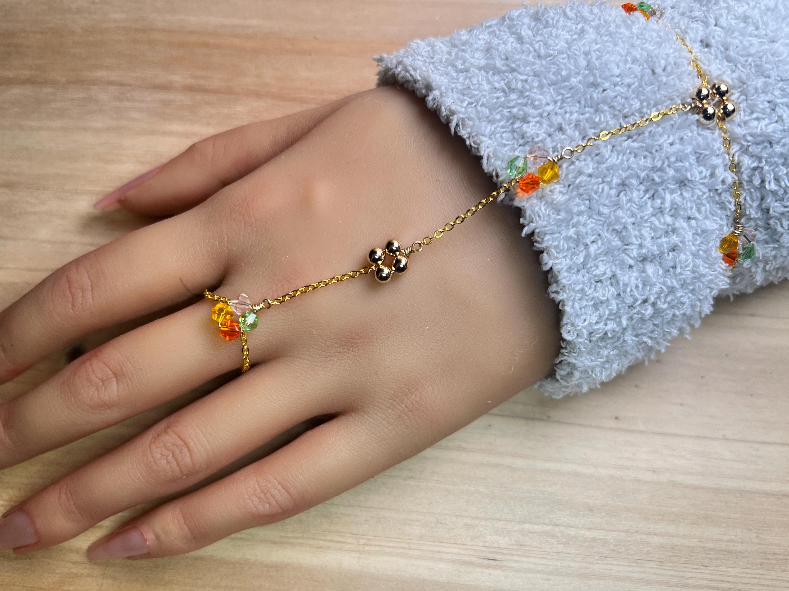 The chain ring has a circumference of 3 inches, the chain between ring and bracelet is 4 inches and the bracelet is 7 inches long. please feel free to message me for any size customizations at no extra charge.