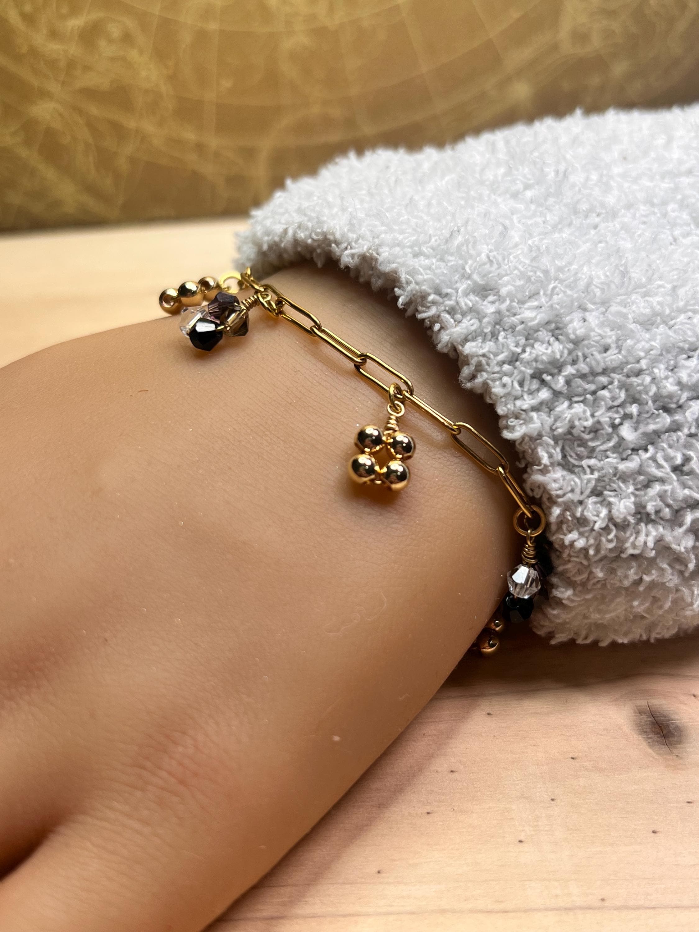 GOLD: gold plated (over brass) wire with gold plated round spacer beads and 3 mm wide chain
