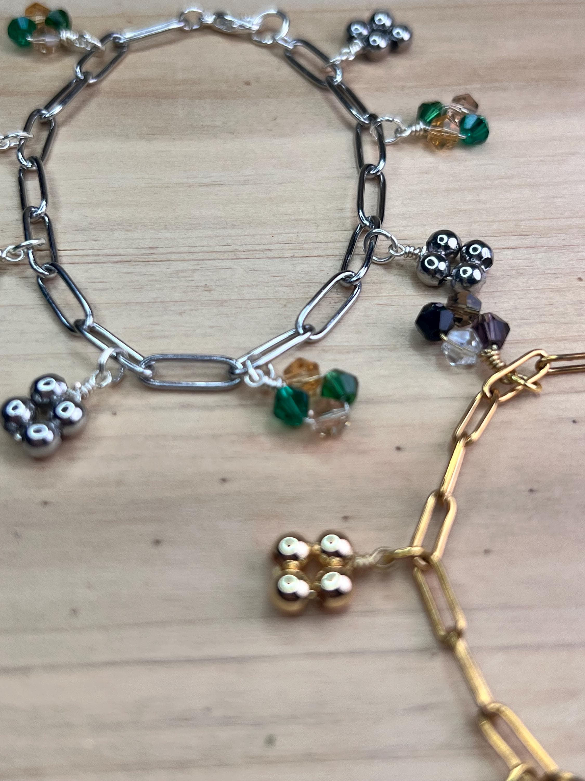 SILVER: silver plated(over brass) wire with stainless steel round spacer beads and 4 mm wide chain