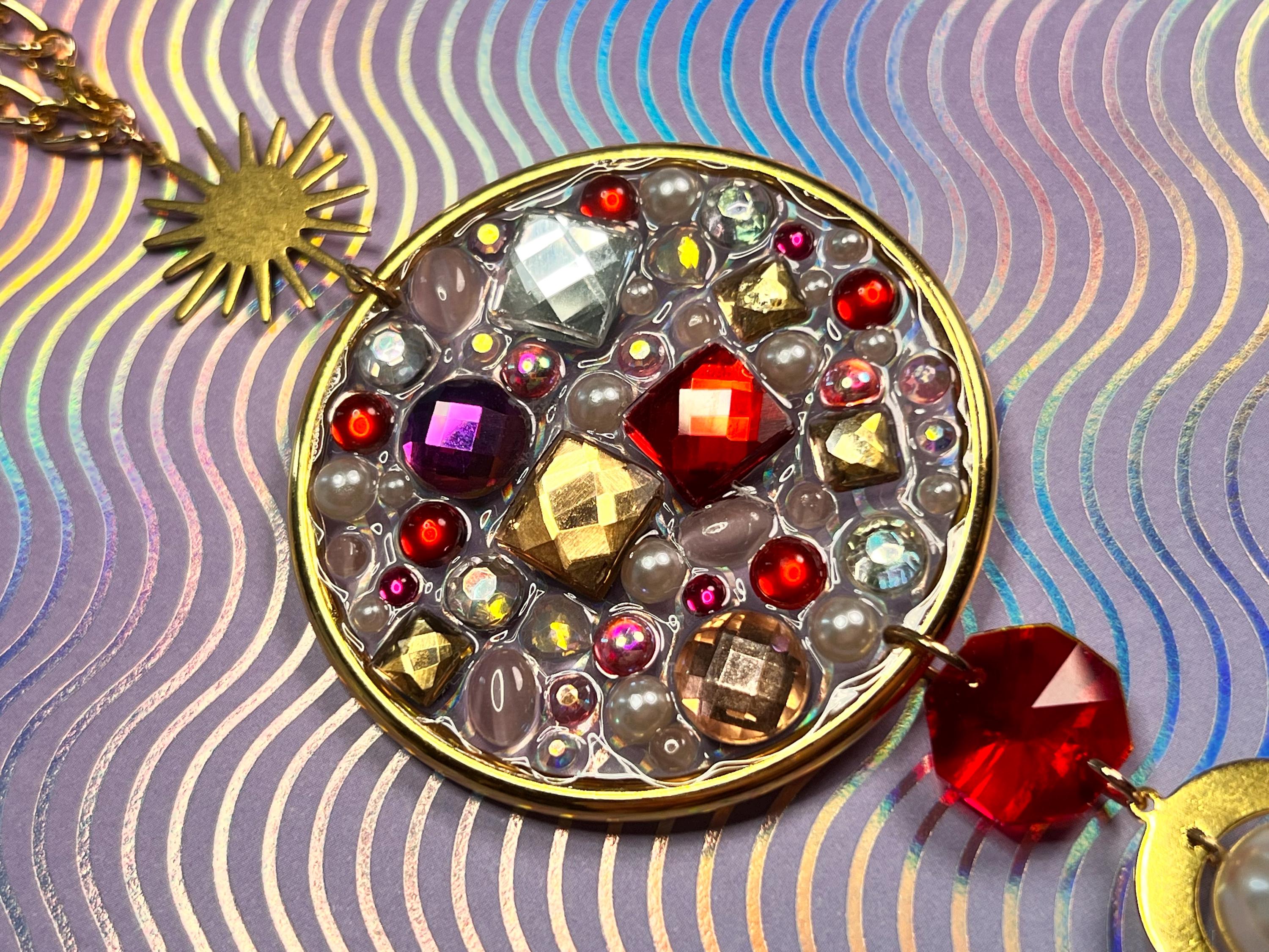Made with resin, dye, metal and mosaic glass pieces.